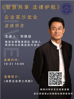 直播預告|《智慧共享法律護航》企業家沙龍會本期將邀請煥廷法律服務集團創建人劉煥廷主任,為企業家們解讀《淺析企業用工風險》。