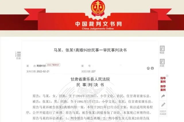 判決書顯示,馬女士與張先生經(jīng)人介紹,于2016年1月1日按照當(dāng)?shù)亓?xí)俗舉行婚禮,2016年2月5日在康樂縣民政局辦理結(jié)婚登記,婚后生下一子一女。2019年,女兒感染肺炎,馬女士帶女兒去看病,向自己父親借款5000元用于孩子治療。在馬女士看來,丈夫及其家人對(duì)女兒不管不問。